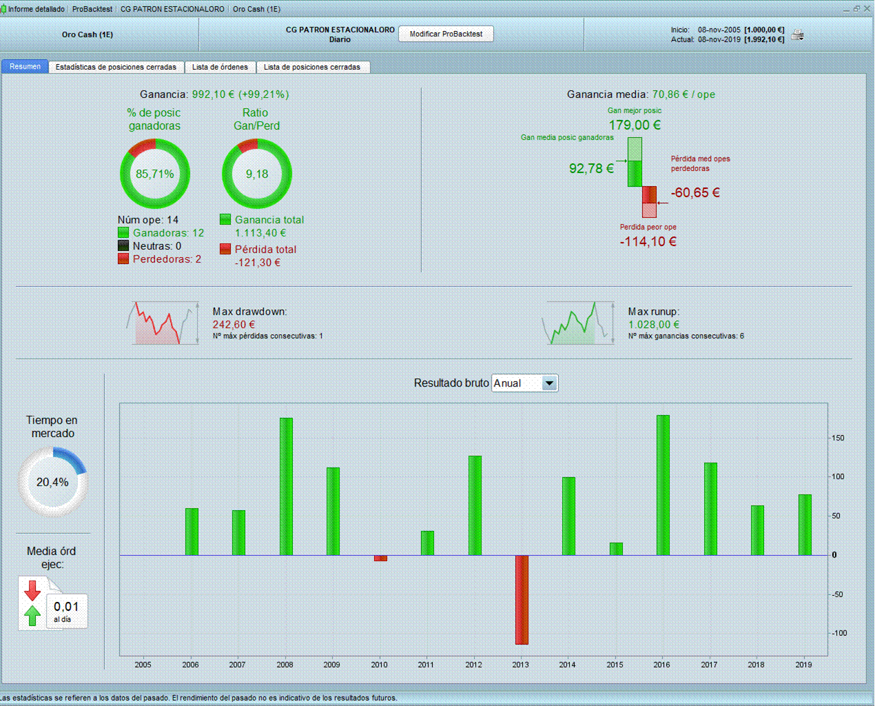 Durante estos 14 años ha tenido un porcentaje de aciertos por encima del 85%, teniendo un extraordinario ratio ganancia/pérdida de 9.18.  Se ganan 9$ por cada uno que se pierde. En el siguiente cuadro mostramos los datos con más detalle.