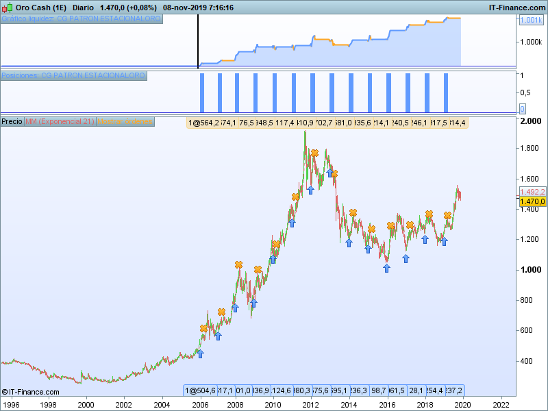 Durante los últimos años, particularmente desde el año 2005 vemos un patrón que viene funcionando muy bien incluso en años en donde el oro entra en mercados bajistas. Se trata de ponerse largo en oro entre el 10 y el 15 del mes de diciembre y cortar posiciones a finales de febrero.