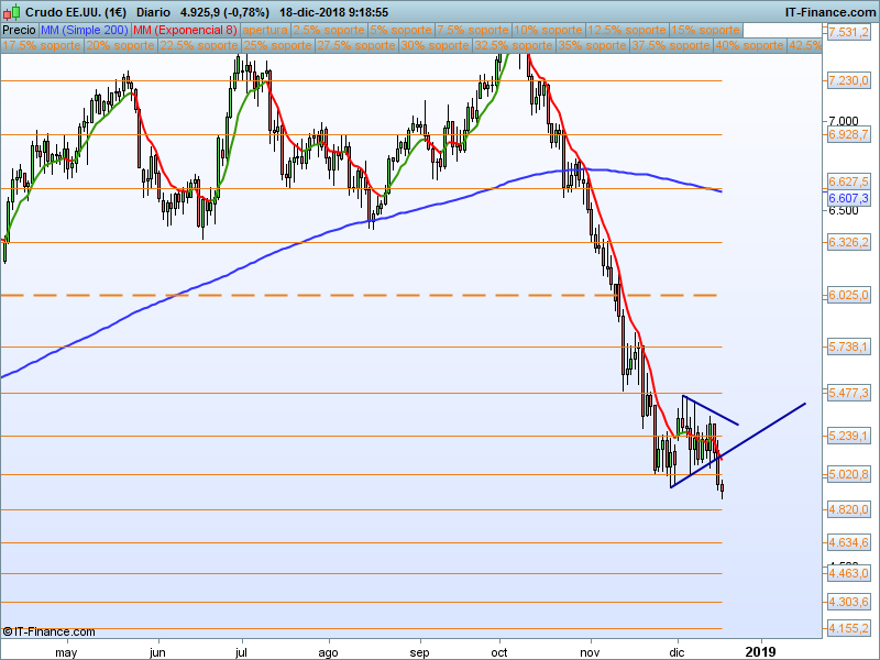 WTI,09:17:36. Pluff!!!, el soporte 5020 hace aguas, ha podido contener al precio durante unas dos semanas, pero ya veníamos diciendo que no tenía fuerza para alcanzar la corrección propuesta en el PAA 60.25. Veremos como reacciona en el 48.20.
