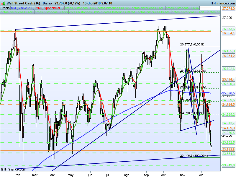 DOW JONES,09:07:52.- Llegada al SOR 26313 y rechazo. Estamos en zona de mínimos del año, el soporte que dio rechazo a las caídas de primeros de año. Esto unido a otro factor técnico adicional (que pueden ver en el vídeo) nos pueden hacer pensar que es buena zona para intentar el rebote.
