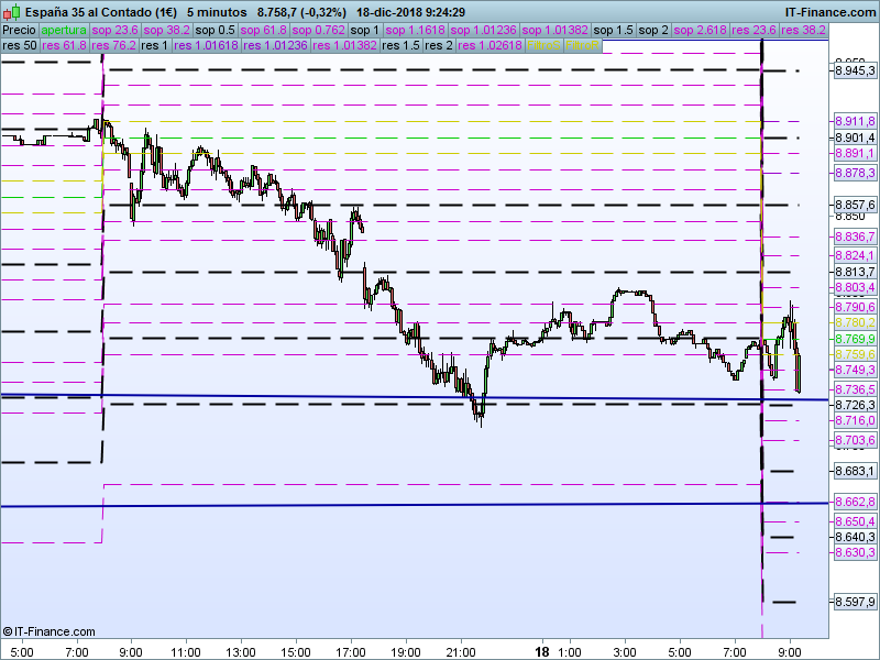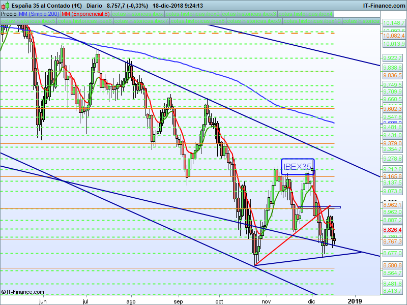 IBEX35,08:35:55. – Estamos en zona del SOR 8767, cierres por debajo nos hacen pensar en ver nuevos mínimos y búsqueda del 8580 SOR. Punto de reversión en 8962.