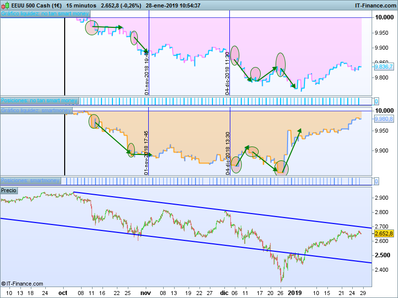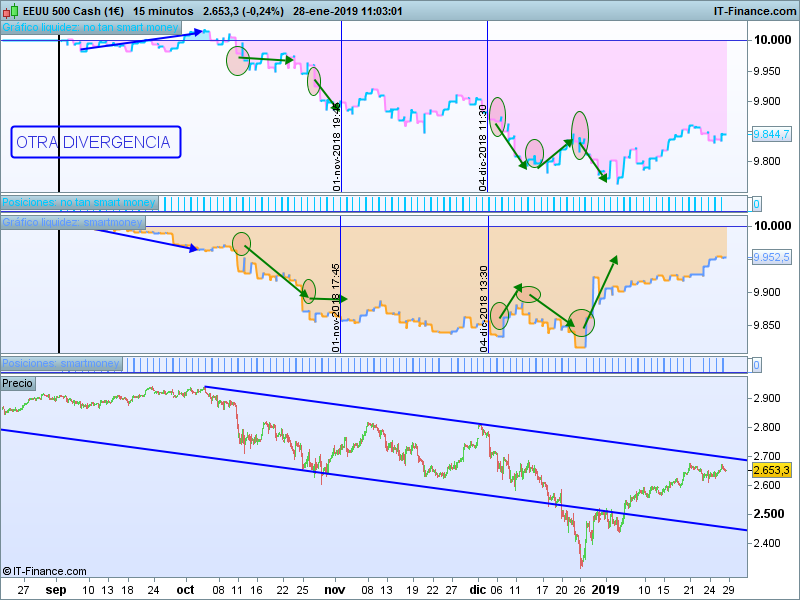 Hemos rodeado las zonas en donde se ven claras divergencias en los comportamientos de unos y otros y donde es curioso ver como hacen cosas totalmente diferentes. En el primer círculo por la izquierda (al inicio de las caídas) vemos como el smart money soltaba papel mientras los pequeños inversores ni se inmutaban y cuando quisieron darse cuenta y empezaron a vender, la mano fuerte sostuvo el precio. Durante el mes de noviembre se mantuvo una línea de actuación más o menos paralela, para encontrar otra vez grandes divergencias en el mes de diciembre. ¡Hacen totalmente lo contrario!. Especial atención merece la última divergencia que tenemos marcada en el círculo de finales de diciembre.