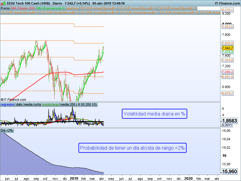 La volatilidad endógena es del 1.85%, mientras que la probabilidad de ver un día alcista de rango mayor al 2% es del 15.96%, el doble que en el SP500.