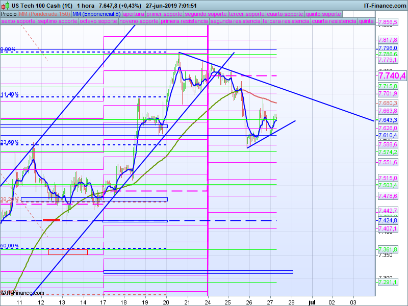 En gráfico de H1 vemos como de nuevo el SOR trimestral 7610 ha vuelto a frenar al precio, formando una zona de soporte-resistencia importante junto con el SOR anual 7634. Por patrones, la pérdida de este zona abriría la puerta al precio de apertura trimestral en 7425, pero recordemos que estos niveles trimestrales están a punto de caducar, nos servirán para hoy y para mañana.