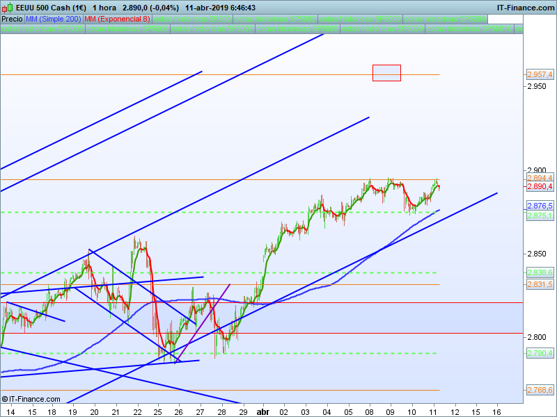 El SP500 vuelve a pegarse al 2895 y se queda en situación similar al Nasdaq, con máximos algo más lejos y con menor volatilidad endógena. El menos fuerte es el Dow Jones, que sigue confirmando patrón de fallo.