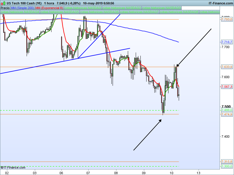Ayer comentábamos en estas mismas páginas que deberíamos estar preparados para un comportamiento extremadamente volátil por la aparición de cualquier tipo de comentarios referentes a la guerra comercial. No hubo sorpresas, en el gráfico adjunto del Nasdaq100 verán lo que comentaba antes de saber donde y cuando hacerlo.