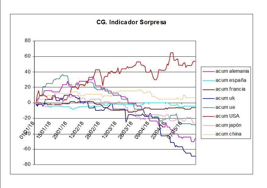 Dado que desde nuestra humilde posición no tenemos acceso a estas fuentes, nos hemos fabricado nuestro propio indicador de sorpresa y lo hemos elaborado para seguir las zonas que más nos pueden influir en nuestra operativa: EEUU, UE, España, Alemania, Francia, Reino Unido, Japón y China.