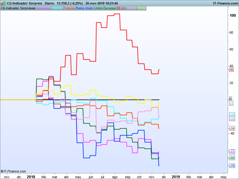 La verdad es que esta quincena analizada no ha traído sorpresas significativas. Es destacable el caso de Reino Unido, que tras una mejora durante el verano, desde Octubre ha vuelto a mostrar una gran consistencia negativa. En Europa siguen pintando bastos, pero al menos estas dos últimas semanas no se ha empeorado la situación, salvo en el caso de Francia que si empeora algo más-