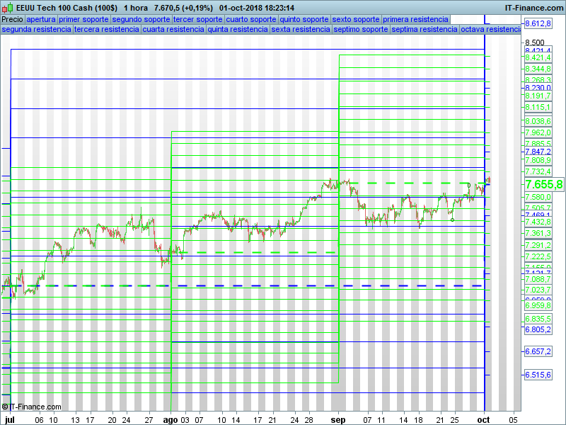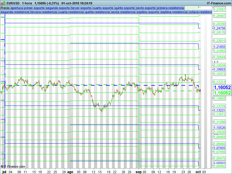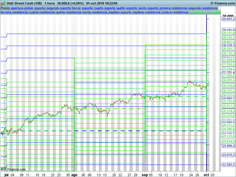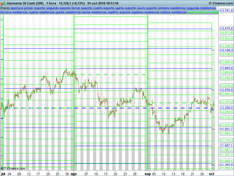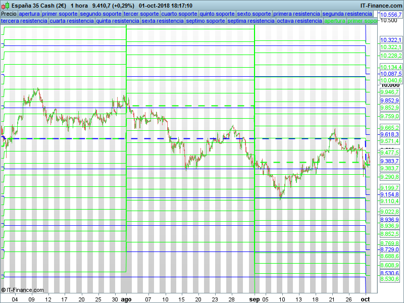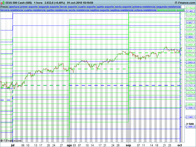 Al coincidir el inicio del mes con el del trimestre, vamos a superponer ambos niveles en el mismo gráfico, pero advertimos que puede, en algún caso, se solape algún SOR mensual con trimestral. También, puesto que es el inicio de esta sección, vamos a graficar el trimestre anterior para que el lector pueda comprobar como funcionan estos soportes y resistencias. Las líneas verdes son los mensuales, las azules los trimestrales, las líneas gruesas discontinuas los precios de apertura respectivos. Empezamos.