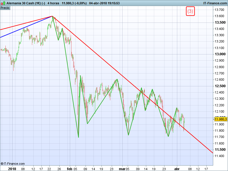 Dibujamos las ondas en color verde, y dada la complejidad que encontramos en su desarrollo (como buena onda 4 de elliot), lo mejor que podemos hacer es ir a buscar otro activo en donde nos resulte más sencillo trabajar. Si nos va la marcha e insistimos en sacar algo bueno del DAX, lo más recomendable seria bajar al gráfico de 15 minutos.
