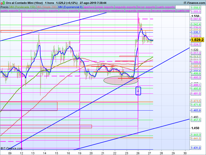 Si bajamos a gráficos de H1, y a más corto plazo, mientras estemos por debajo del SOR anual 1537 podríamos considerar que estamos dentro de un movimiento correctivo, siempre y cuando no rompamos los niveles señalados anteriormente. Solo la recuperación del SOR 1537 activaría de nuevo nuestra predisposición alcista.