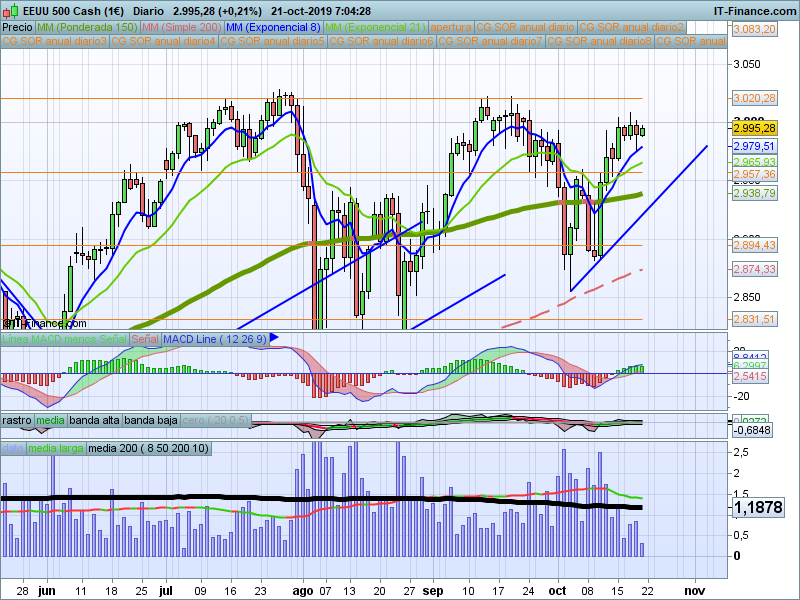 Este último nivel, calculado a principios de año, se está mostrando como una cota de resistencia muy significativa, en los últimos meses hemos intentado su perforación hasta en 4 ocasiones sin conseguirlo, ¿será en esta ocasión diferente?, veremos, de momento lo primero que tiene que hacer el precio para poder plantear la pregunta es llegar a esta cota, puesto que hemos visto que desde el pasado 11 de octubre que cerramos por encima de 2957, hemos ido gastando tiempo sin intentar el asalto.