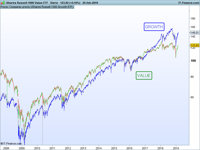 Una imagen vale más que mil palabras, vean en el siguiente gráfico la comparación de dos ETFs «temáticos». El Russell 1000 value ( en verde) y el Russell 1000 Growth (azul).