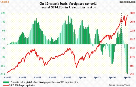 En cuanto a movimiento en los mercados, Wall Street reaccionó moderadamente al alza, haciendo buenos los soportes marcados y poniendo rumbo de nuevo a los máximos históricos para perpetuar el mayor mercado alcista de la historia. Lo curioso es que alcanzará estos máximos con un balance bastante negativo en cuanto a flujo de fondos se refiere en lo que llevamos de año. Semana tras semana no hemos visto otra cosa que no sean salida de fondos de la renta variable. En este gráfico de hedgopia.com pueden observar en particular el flujo de fondos extranjeros que invierten en bolsa de EE.UU.
