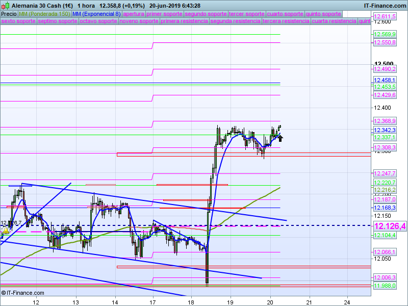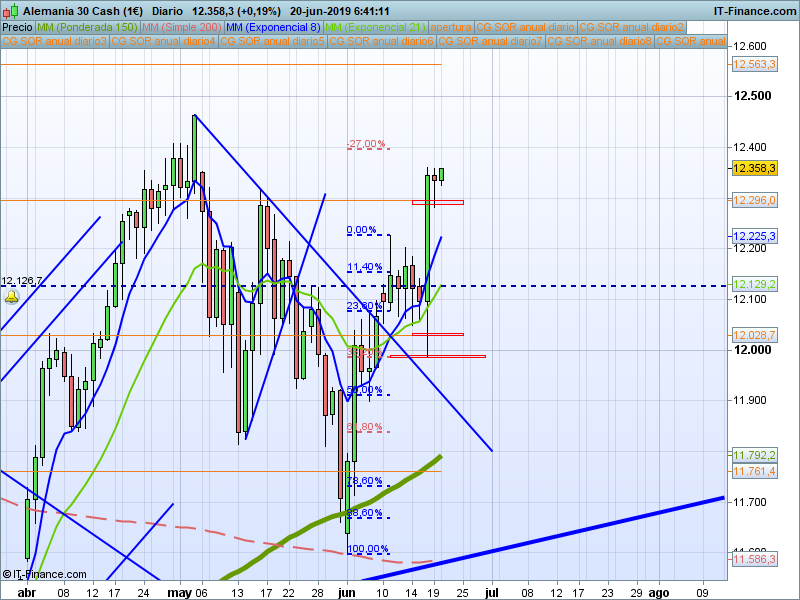 En gráficos de H1 y mientras estemos por encima de 12296 el objetivo alcista de corto plazo debe ser el SOR trimestral 12458, que por otra parte es zona de máximos anuales.