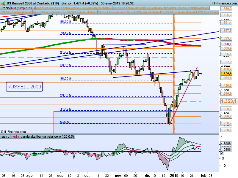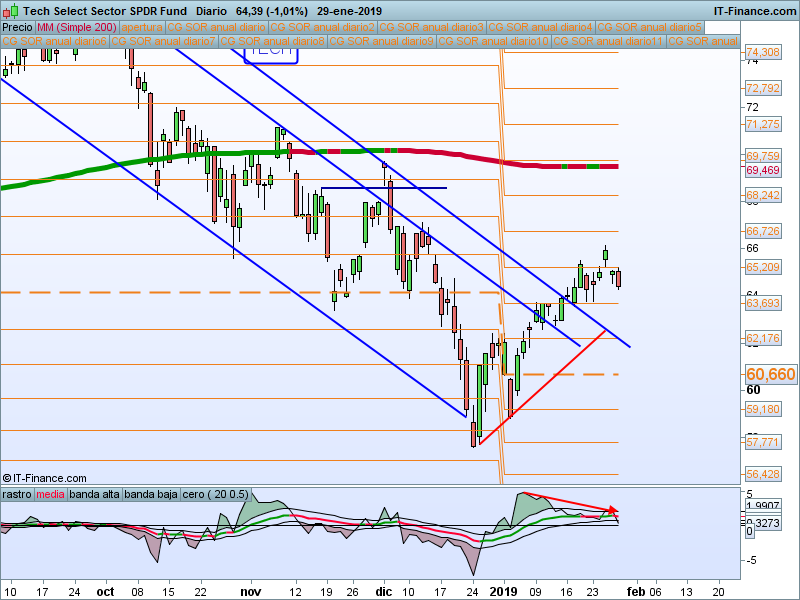 Vamos a estar muy condicionados por los resultados de las FAANG, ayer Apple mostró resultados algo mejores de lo esperado por el consenso de analistas, pero sus problemas siguen ahí. Mantenemos predisposición alcista en tanto en cuanto permanezcamos por encima del SOR 63.69. Divergencias en nuestro indicador de volumen.
