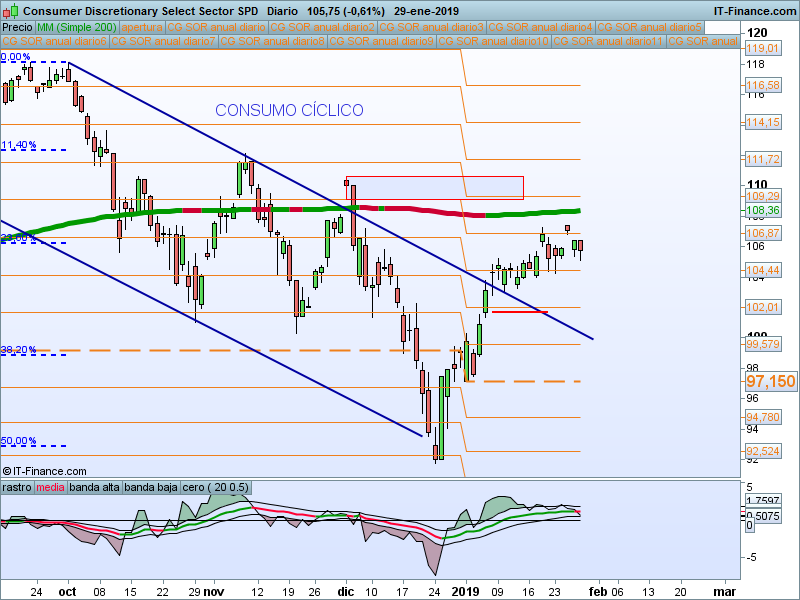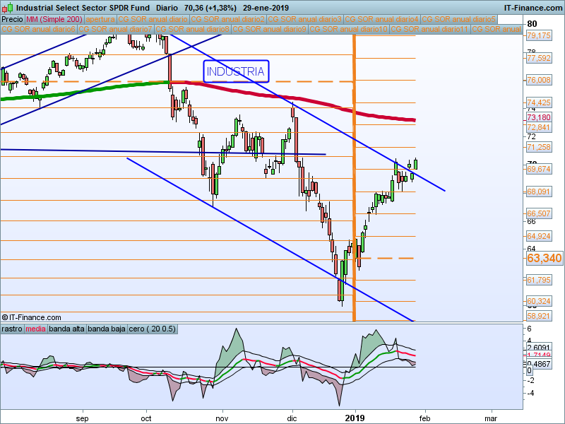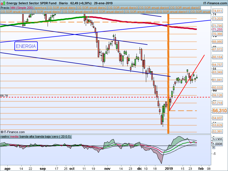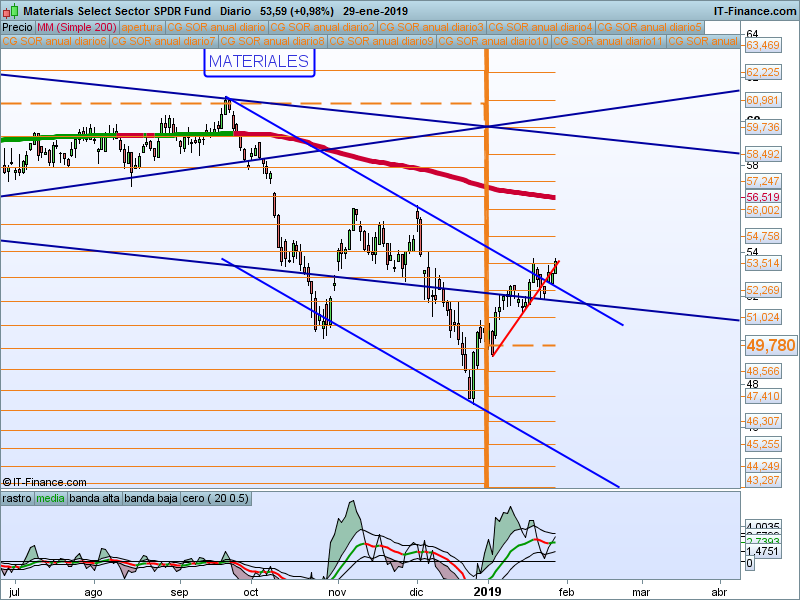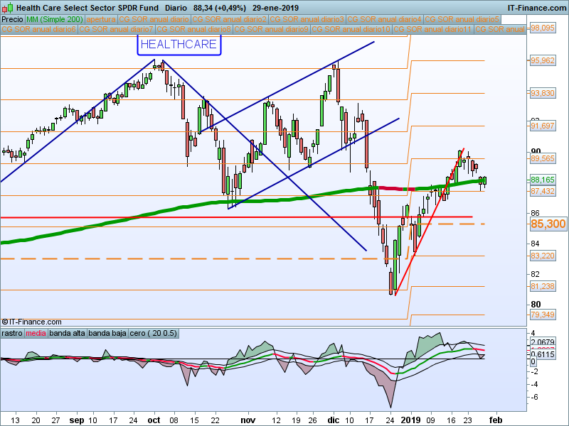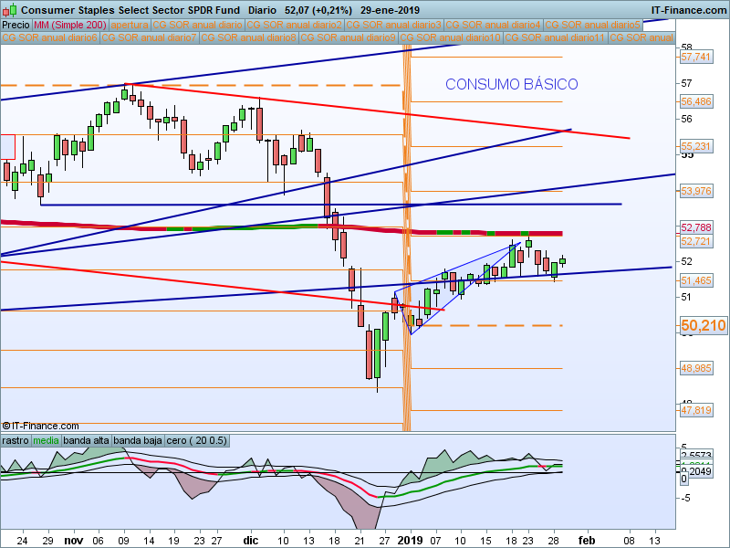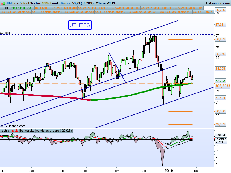 Alcanzado el primer SOR 54.03 y vuelta al precio de apertura anual que va a coincidir con la media de 200 sesiones. Muy atentos a la reacción del precio en ese nivel. Dado el carácter defensivo de este sector, debemos prestarle especial atención en caso de que tengamos un giro en los índices.
