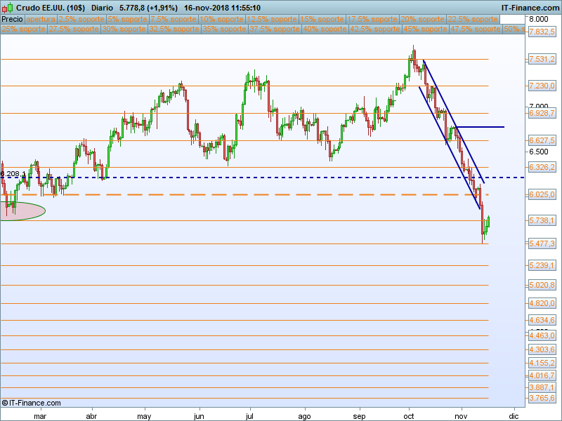 Crudo Ligero WTI.- Ha mostrado mucha debilidad, llegamos a nuestro objetivo del PAA y continuamos con el descenso. Dada la caída tan vertical, es lógico ver una corrección de mayor calado. Pensamos en retesteo al PAA 6025.