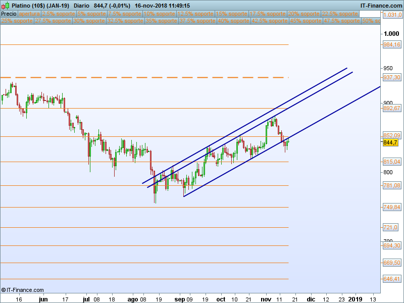 Platino.- Si el precio recuperase el SOR 852 podría ser una buena entrada para buscar el SOR 892 en la parte alta del canal. Mientras permanezca por encima de 815, predisposición alcista.