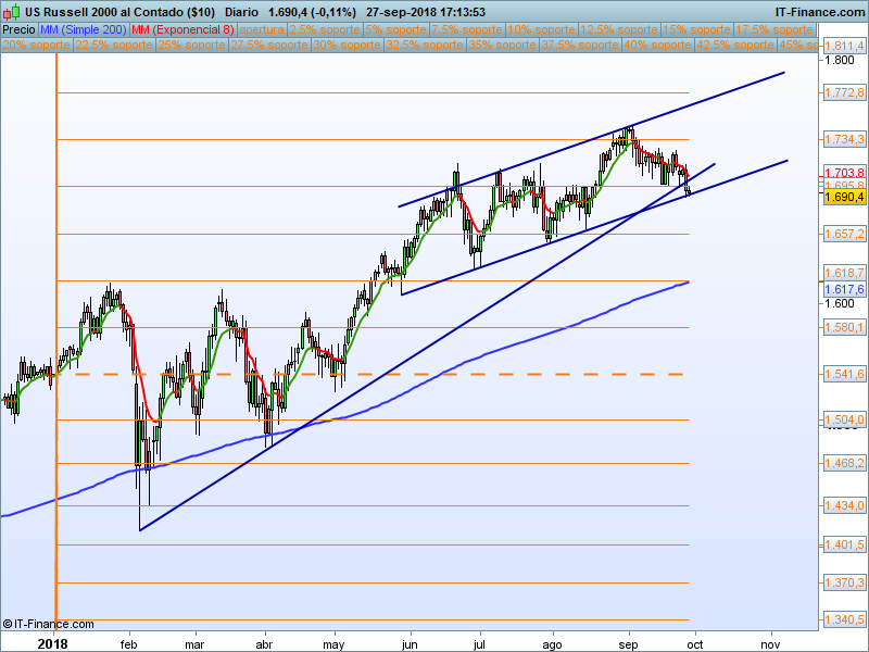Russell2000, 2018-09-27.-Inauguramos hoy una nueva sección titulada «Fuera de mercado». Los lectores que nos siguen saben que a diario venimos analizando en nuestra sección «Apertura de mercados» al Nasdaq100, al S&P500 y más recientemente al Dow Jones. Nuestro espacio y tiempo para el análisis es limitado y no podemos estudiar a diario todos los activos que nos gustaría, pero eso no quiere decir que los dejemos de lado en nuestra operativa o que no los tengamos en cuenta en el desarrollo de nuestro trabajo. Por eso, desde esta sección analizaremos diariamente activos que se quedan fuera de nuestra selección habitual, con el ánimo de que nuestros seguidores puedan tener una visión más global de los mercados financieros. Comenzamos la sección con otro gran índice americano, el Russell 2000.