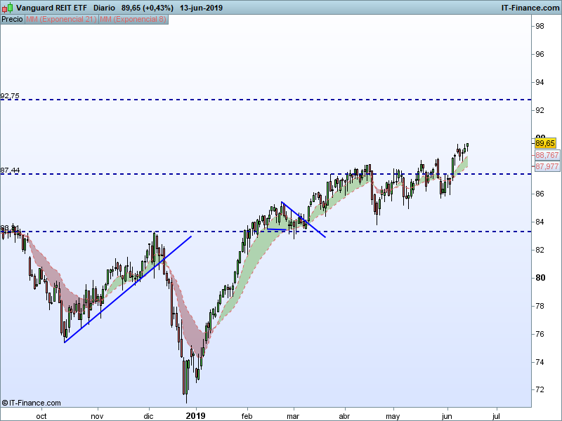 La familia de activos inmobiliarios también presenta en estos momentos un aspecto interesante, tras romper resistencias y consolidar por encima de ellas. Podríamos tener un recorrido de un 3-4% antes de enfrentarse a la siguiente resistencia significativa.
