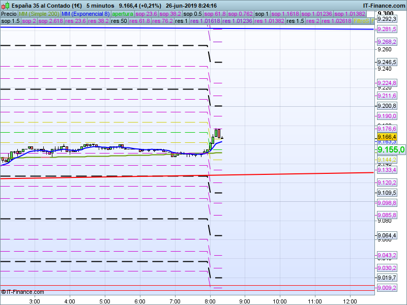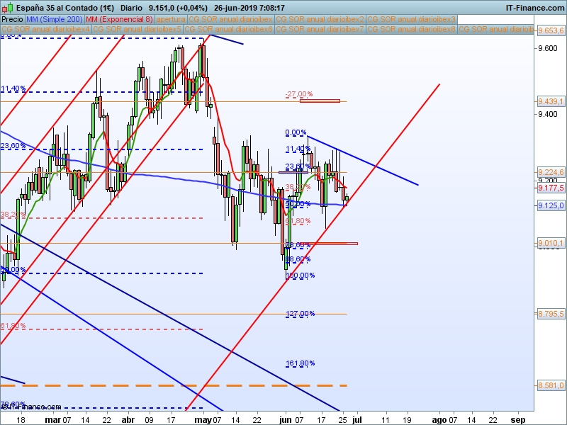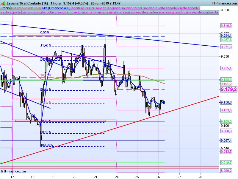 Si bajamos a H1, nuestro gráfico operativo vemos el gran rechazo que tenemos en la zona del precio de apertura trimestral (a punto de caducar) en línea gruesa punteada en azul. Desde ahí se inició un movimiento correctivo que se ha detenido en el primer soporte SOR semanal en 9133, en zona del retroceso del 61.8% del impulsito iniciado el 18 de junio, la recuperación del PAS podría dar un primer aviso alcista, teniendo en cuenta que tenemos por encima el SOR anual 9225.