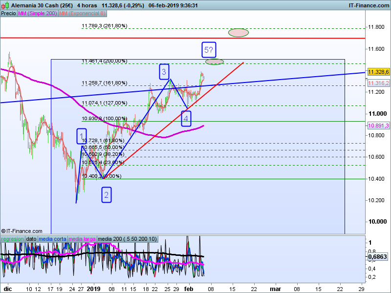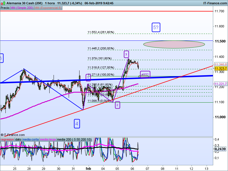 Pasemos a gráficos un tanto menores para intentar ver donde nos encontramos dentro de este movimiento impulsivo de onda 5. En H1 podemos sacar un recuento provisional que nos llevaría a final de onda 3 en el máximo de ayer martes 5 de febrero. La corrección en 4 la deberíamos esperar en la LT2-4 que hemos marcado en grueso para no perder el norte. Cuando tengamos confirmado un final de 4 que nos lleve a un nuevo tramito al alza, entonces podremos «tirar» una nueva LT 2-4 de este último tramo, cuya perforación de forma clara y confirmada con cierres nos indicará el final de todo el tramo impulsivo iniciado a finales de Diciembre.