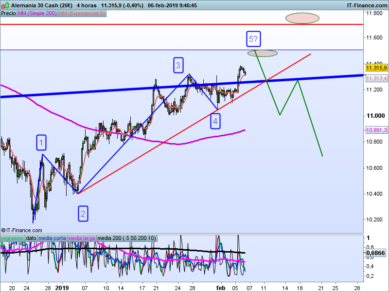 Cuando esto suceda y dependiendo de cual sea el punto en donde finaliza la onda 5, tendremos una pauta correctiva en 3 tramos tal y como dibujamos en el gráfico de H4. Insistimos que hasta no tener confirmación de final del punto 5 no podremos ser más exactos en cuanto a los recorridos estructurales.