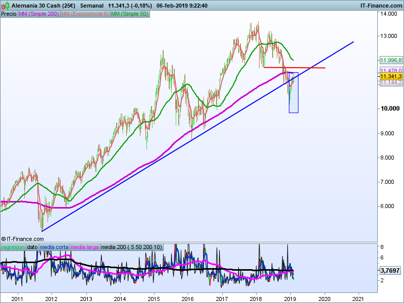 No se trata de ver la estructura a largo plazo, que poco ha cambiado de momento. Nos vamos a centrar en analizar el tramito que hemos marcado en el recuadro en este gráfico semanal: