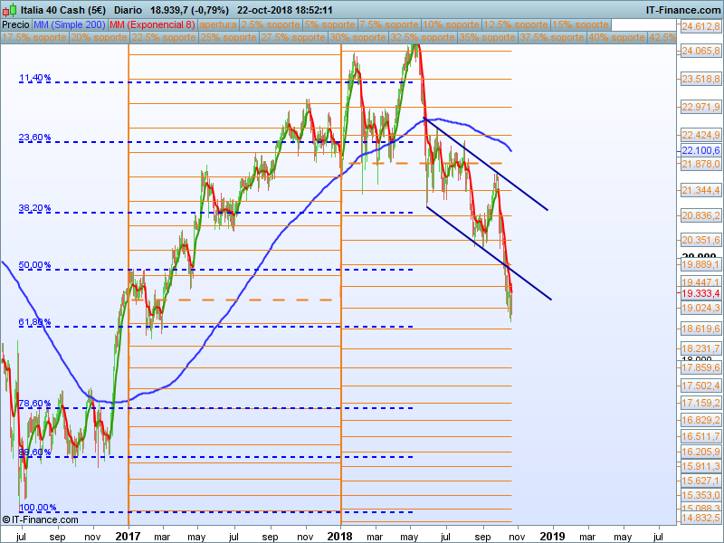 FTSE MIB.- El índice italiano está acusando enormemente la gran inestabilidad política interior. En estos momentos estamos llegando a zona del 61.8% de la subida iniciada en julio de 2016, por lo que es muy probable que llegue a esa zona coincidente con el SOR 18619 e intente rebotar.