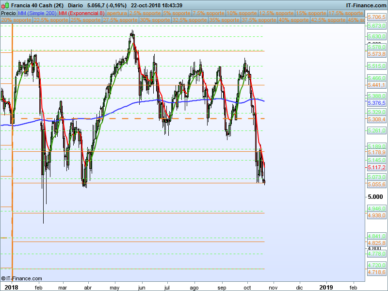 CAC 40.- Durante el año ha mostrado mayor fortaleza que el Stoxx50 o el DAX. Aún le queda para llegar a zona de mínimos anuales, pero si es cierto que estamos en zona de cierres mínimos del año. Cobra mucha importancia el SOR anual 5055, ya que es el que se ha encargado de contener a los cierres más bajos del año. Un cierre diario por debajo de este nivel nos llevaría al siguiente SOR 4938 donde nos encontraremos con un doble soporte, al coincidir cera un refugio histórico. Podríamos considerar que esa es zona de mínimos anuales por lo que no pensamos que haya perforación en el primer intento.