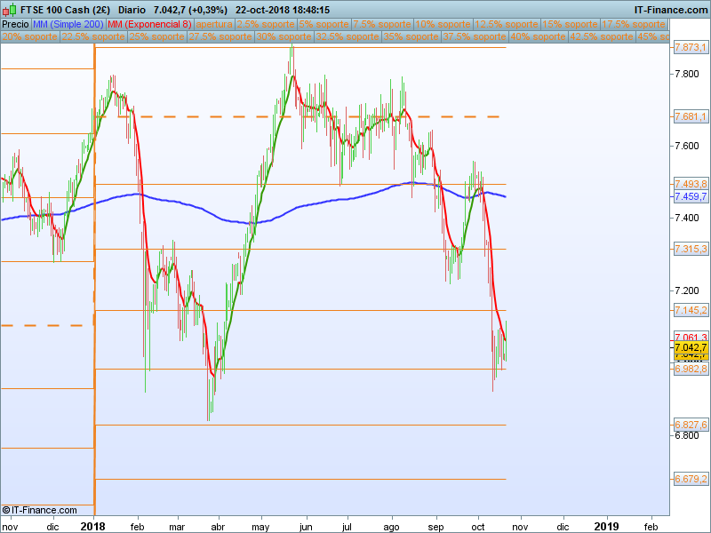 FTSE100.- Estamos en una situación similar a la del índice Francésen cuanto a fortaleza se refiere, puesto que con las caídas iniciadas en el mes de junio aún no se han roto los mínimos anuales. EL sor 6982 lleva casi 10 días frenando al precio en su caída, en caso de perforación y cierre, tendríamos el siguiente objetivo en los mínimos del año.