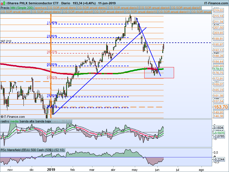 Comentábamos en análisis pasados que cualquier movimiento impulsivo alcista de los índices debería pasar en primer lugar por ver una recuperación del sector tecnológico y más concretamente por el índice de semiconductores, especialmente castigado por las guerras comerciales.