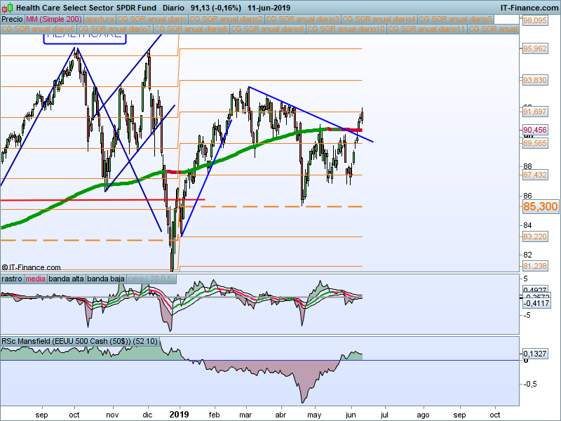 El mes de julio suele ser un buen periodo estacional para cuidados de salud. Ya hemos venido comentando que estructuralmente veíamos una formación que podría propiciar un movimiento alcista. Se ha perforado la 0B y estamos en este momento por encima de la media de 200 sesiones, mientras se den estas condiciones podemos mantener predisposición alcista.