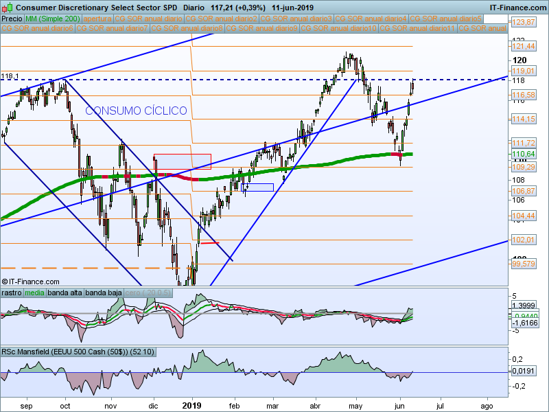 Es un sector que se está mostrando algo más débil que su índice de referencia (SP500), aún así,mentras estemos por encima de la media de 200 seguiremos adoptando predisposición alcista.