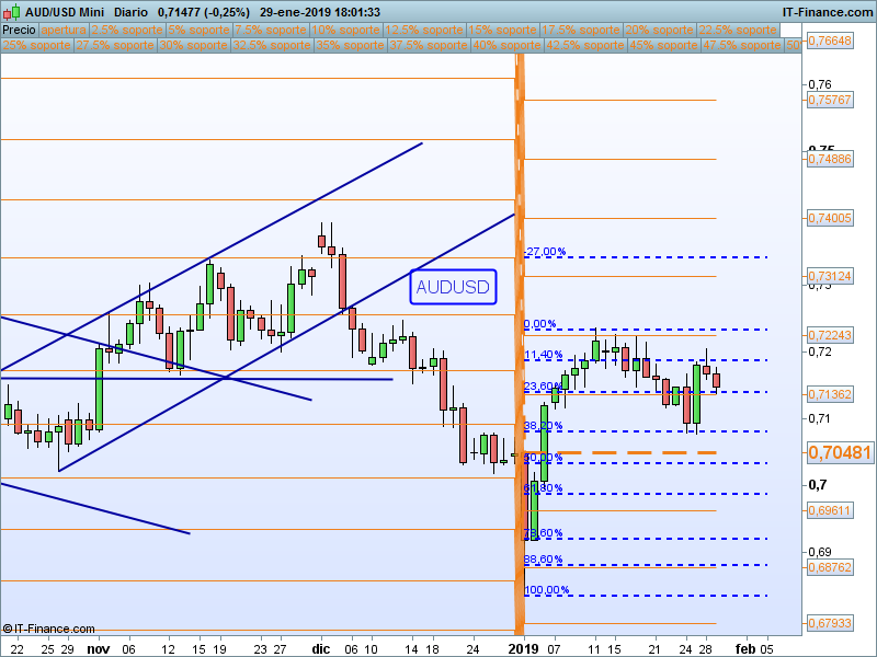 Movimiento correctivo tras el rechazo en la segunda cota alcista. En estos momentos estamos en zona de SOR 0.71362, con cierres por debajo podríamos continuar con la estructura correctiva de corto plazo hasta el PAA