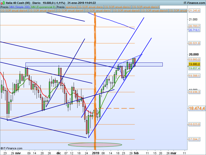Pues también hemos llegado a zona de resistencia significativa. SOR 19860 y zona de anteriores máximos relevantes. La perforación de esta zona ha invalidado la estructura bajista de corto plazo, pero vemos la posible formación de una terminal justo en esta zona. Mientras estemos por debajo de 19860 deberíamos pensar en el 18936 SOR para que se cumpliese dicha pauta.