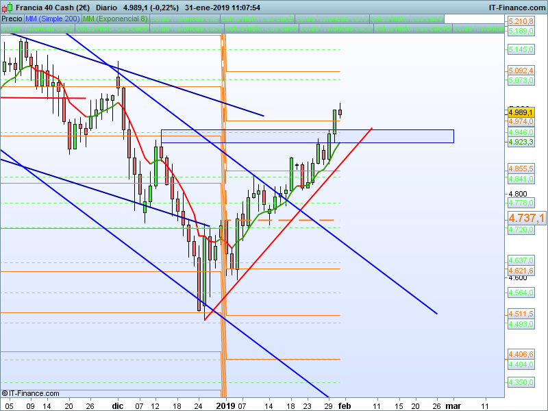 Ha alcanzado el SOR 4974, mientras permanezcamos por encima debemos mantener predisposición alcista, si tenemos cierre por abajo, tenemos un recorrido hasta 4855