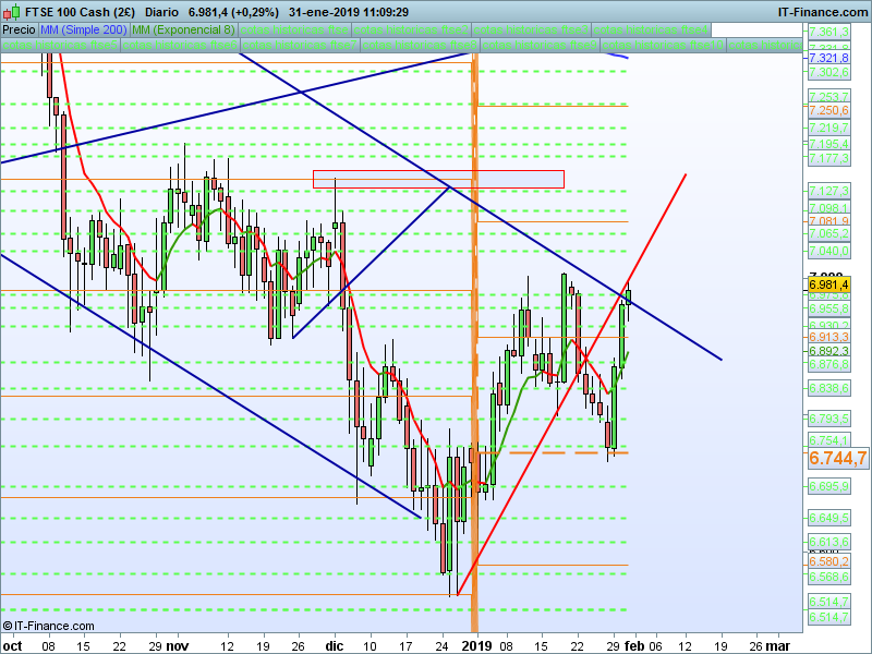 Estamos en la parte alta del canal tras haber encontrado soporte en el precio de apertura anual. Mientras estemos por encima del SOR 6913 debemos seguir manteniendo la predisposición alcista.