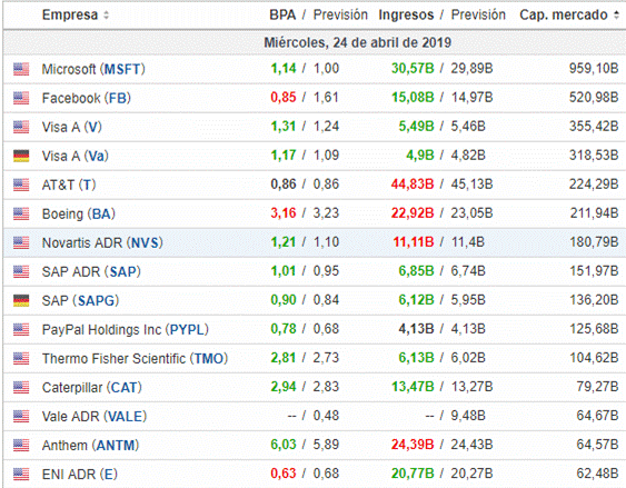 Resultados empresariales del 24/04/2019. Publicado por Julio Fdezel 25 abril, 201925 abril, 2019Estas son las principales empresas que presentaron resultados en el día de ayer.Fuente: investing.comSeguir leyendoArtículo anterior Analizamos las empresas que hoy presentan resultados.Artículo siguiente Análisis de #Amazon y otras empresas que hoy 25/04 presentan resultados.