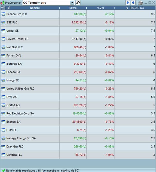 «CG Termómetro» es un screener o buscador programado especialmente para la plataforma gráfica ProReal Time y realiza una evaluación técnica tomando como referencia indicadores tendenciales, de momento así como de volatilidad. El indicador ordena de 0 a 10 el aspecto técnico de cada activo. Antes de tomar cualquier decisión respecto a los valores aquí señalados, recomendamos revisar la estructura del precio y la situación de la cotización respecto a zonas de soporte o resistencia relevantes.