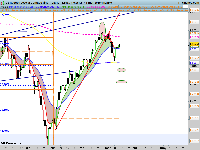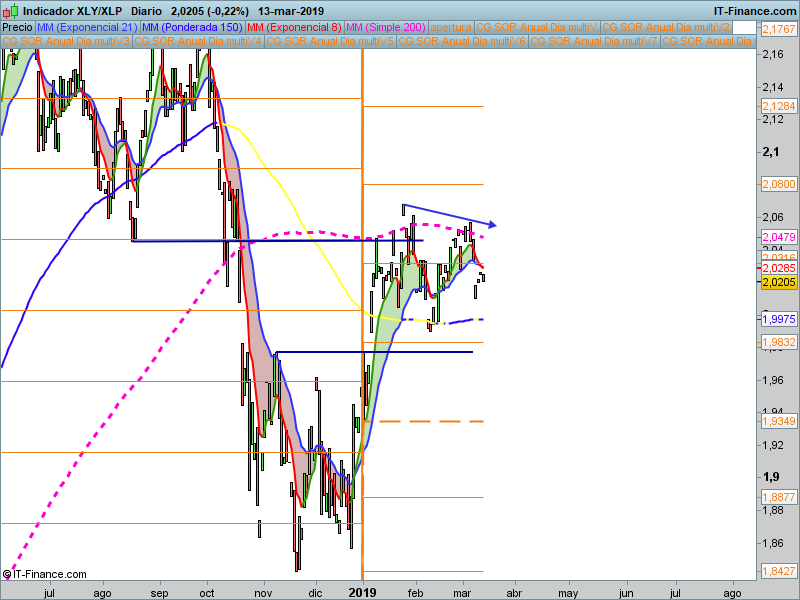 Seguimos teniendo divergencias. Publicado por Julio Fdezel 14 marzo, 2019Nos hemos vuelto a encontrar con otro máximo anual del SP500 pero las divergencias con el XLY/XLP se siguen manteniendo.También vemos como la pequeña y mediana capitalización no está siguiendo el ritmo que están imponiendo el Nasdaq100 y el Sp500. Seguir leyendoArtículo anterior Trump deja en tierra al Dow Jones. Análisis de apertura.Artículo siguiente Jornada de vencimientos. Apertura de mercados