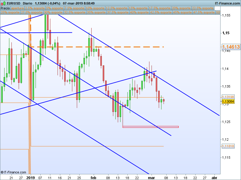 Como venimos comentando a diario, mientras estemos por debajo del SOR 1.1320 debemos mantener nuestra predisposición bajista, más si cabe cuando el precio fue incapaz de alcanzar el PAA en el anterior arreón alcista. En caso de noticias que fortaleciesen al euro o debilitasen al dólar, el nivel que no deberíamos superar sería la LT bajista marcada en azul.