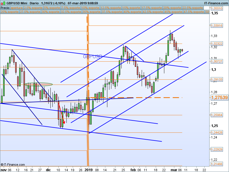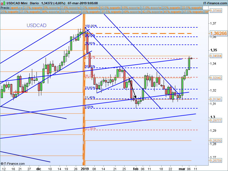 Toque al punto al SOR 1.3458 y ahora toca ver lo que pasa ahí, es retroceso del 61.8% del anterior impulso bajista. Cierres por encima nos predisponen a buscar el PAA2019.