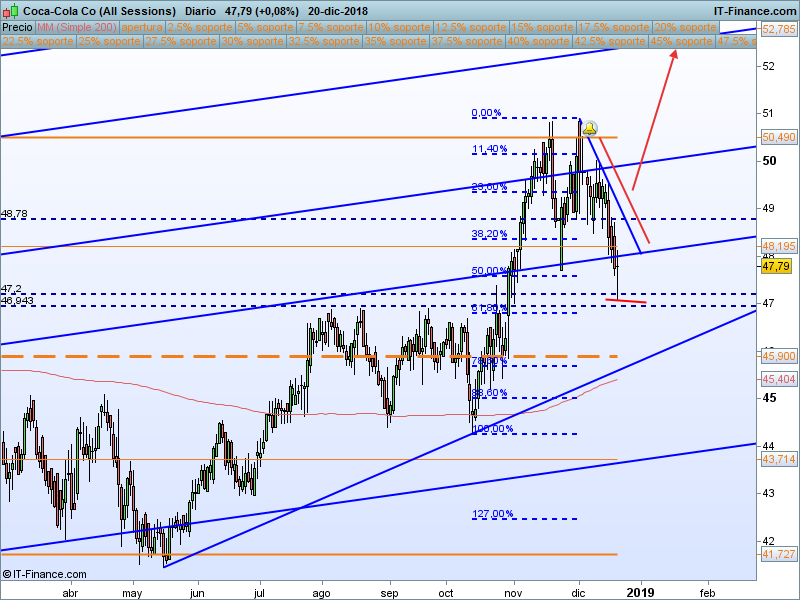 Coca Cola (KO).- Seguimos dentro de la tendencia alcista de largo plazo, hemos iniciado corrección en el SOR 50.49. Si el precio consigue cerrar por encima del SOR 48.19 será una primera señal, habría que tomar el corte de la 0B (con la campanita) para intentar un largo hasta la zona señalada en el SOR 52.78. Stop Loss ajustado y protegido por debajo de SOR y línea de tendencia. Si antes de producirse el evento de disparo tuviésemos una cierre por debajo del precio de apertura anual (la linea gruesa naranja punteada), descartaremos la operación.
