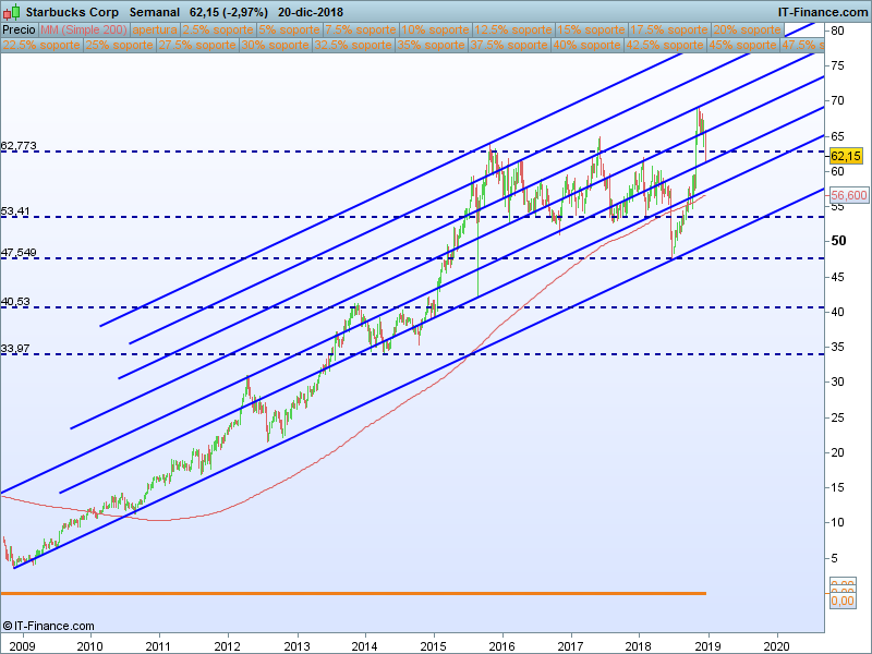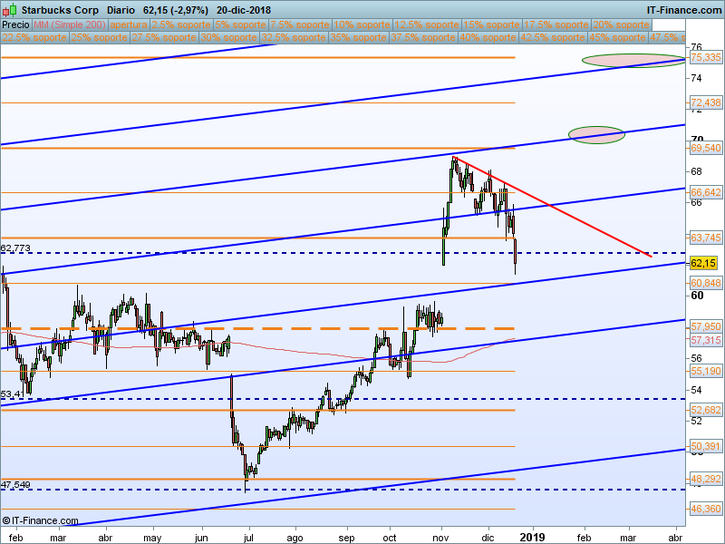 Starbucks(SBUX).- Otro valor con tendencia de fondo alcista que ha venido a retestear el último soporte relevante. Será interesante ver en primer lugar el cierre semanal y ver que efectivamente se cierra por encima de este. Si el precio retrocediese por debajo del Precio de apertura anual, lo descartamos, pero si consigue recuperar le SOR 63.74 y rompe la 0B trazada en rojo nos podría dar un tramo alcista interesante .