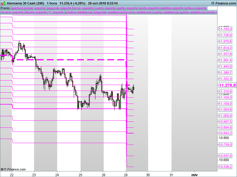 DAX.- La pasada semana, tras un inicio claramente alcista en donde se llegó de forma milimétrica a la tercera resistencia, terminó muy bajista siendo el soporte del 4% el que cerró el paso de forma clara y también milimétrica.