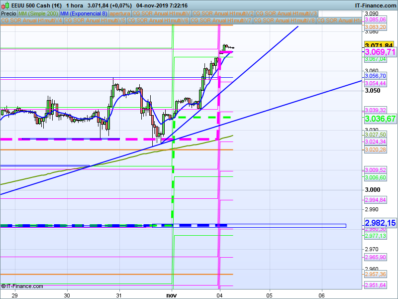 A muy corto plazo, mantendremos predisposición alcista mientras estemos por encima del primero, si vemos que durante el día de hoy nos vamos situando por debajo de este, podríamos ver movimientos correctivos que nos podrían llevar hasta el SOR trimestral 3056 con una extensión al PAM.