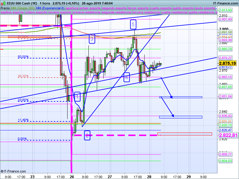 Si bajamos a gráficos de H1, se puede apreciar de forma más precisa el rechazo producido en ese nivel. Dentro de nuestro mejor recuento, hemos visto el posible despliegue desde el lunes de una pauta impulsiva de 5 ondas con finalización en el SOR anual 2894. La rotura de la línea 2-4 nos indica la terminación de esta pauta dando lugar al movimiento correctivo en el que nos encontramos en este momento. Dado que se trata del primer impulso, deberíamos ver el final de corrección entre el 50 y el 61.8%, siendo la zona de 2851 el escenario que consideramos más probable.