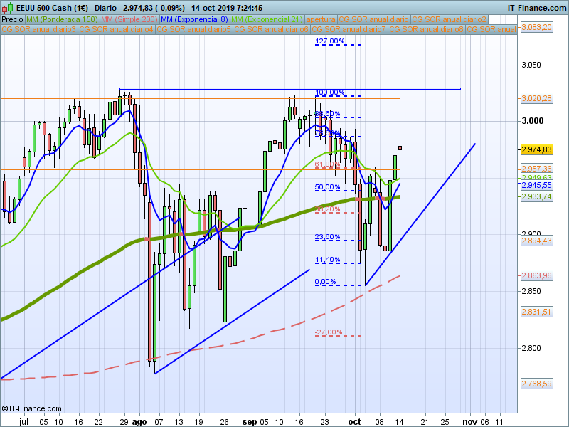 En gráfico diario, lo más relevante es que pese a perder fuelle a última hora, el precio logró cerrar por encima del SOR anual 2957, por lo que mientras estemos por encima de este nivel deberíamos mantener predisposición alcista y habría que ir pensando en preparar puntos de incorporación con el ánimo de atacar de nuevo los máximos históricos.